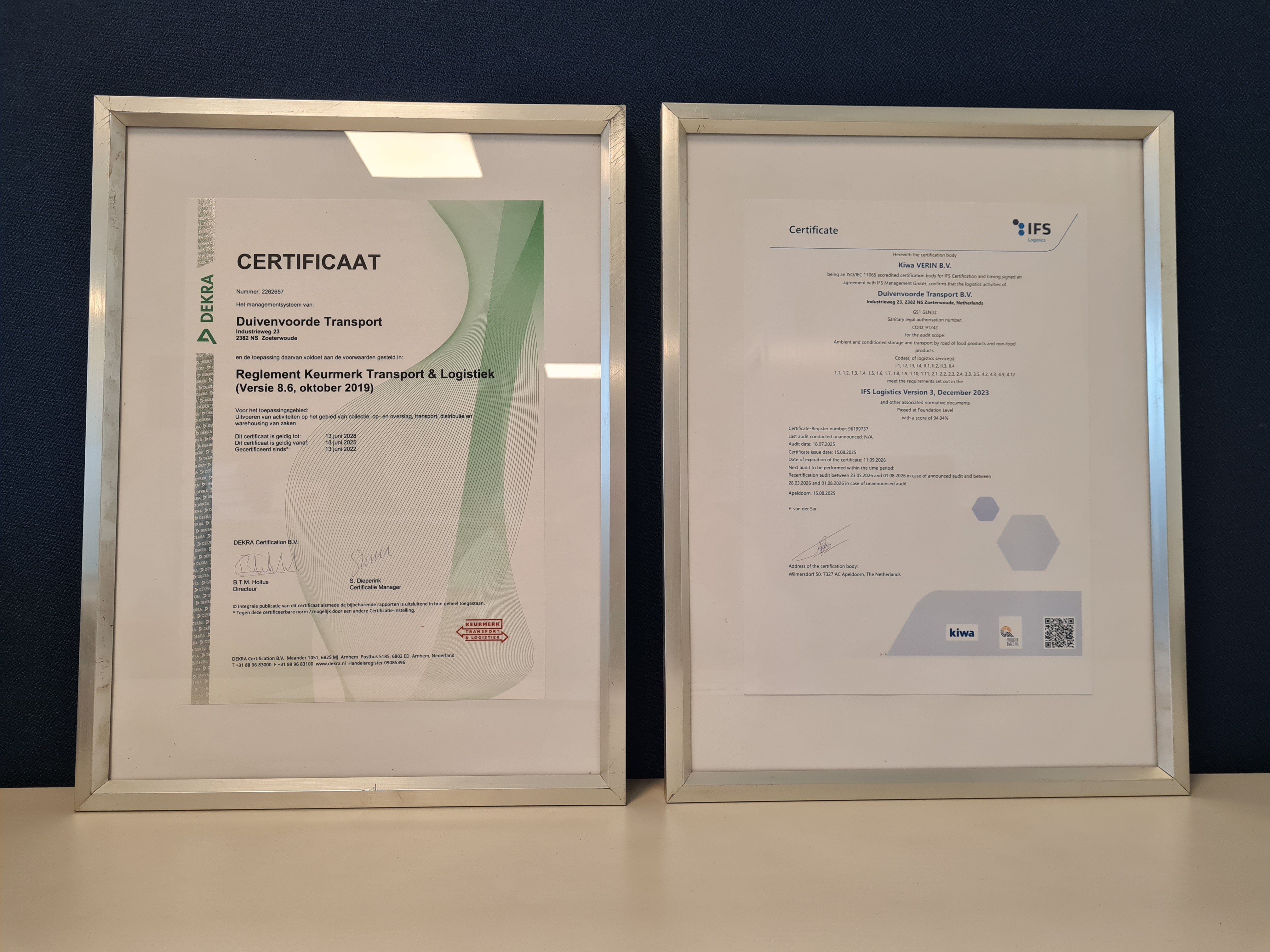 Duivenvoorde Transport heeft al een aantal jaar het kwaliteitsmanagement gecertificeerd volgens de norm van het Keurmerk Transport & Logistiek. De volgende stap was het behalen van het IFS Logistics certificaat. Hiermee wordt niet alleen kwaliteit maar ook voedselveiligheid gewaarborgd. Na een succesvolle audit in juli 2025 is ook het IFS Logistics certificaat een feit.